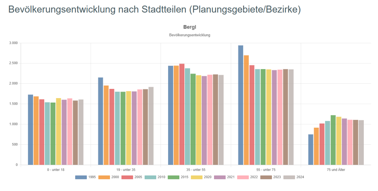 In den Altersklassen der 35-55 Jährigen und der 55-75-Jährigen ist am Bergl, dem größten abgeschlossenen Stadtteil, ein leichter Überhang im Vergleich zum gesamten Stadtgebiet zu verzeichnen.