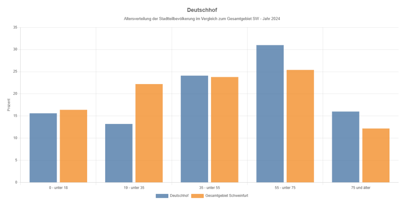 Die Altersstufe 55 bis 75 Jahre liegt 5,6 Prozentpunkte über dem Durchschnitt des Gesamtstadtgebiets.