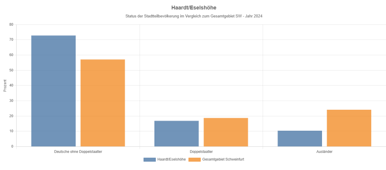 Mit 4.250 (vgl. 2018 4321, 2014 4322, 2010 4171, 2006 3912, 2001 3946) gemeldeten Personen leben 2024 7,6% der Bevölkerung Schweinfurts an der Haardt und an der Eselshöhe. 1.805 Personen leben davon an der Haardt, 2.445 Personen an der Eselshöhe.