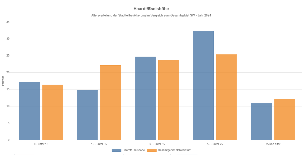 Die Altersverteilung zum Stichtag 2024 hat sich gewandelt. Der Schweerpunkt hat sich von Familien zu einem größeren Anteil zu den 55- bis 75-Jährigen verschoben, diese liegen mit 32,3% 6,9 Prozentpunkte über dem städtischen Durchschnitt. Der Anteil der Kinder und Jugendlichen von 0-18 Jahren liegt 0,8 Prozentpunkt unter dem Durchschnitt des Gesamtstadtgebiets. Der Anteil der 35- bis 55-Jährigen, der Elterngeneration, ist mit 24,7% um 0,9% höher als der Durchschnitt im Gesamtgebiet Schweinfurt.