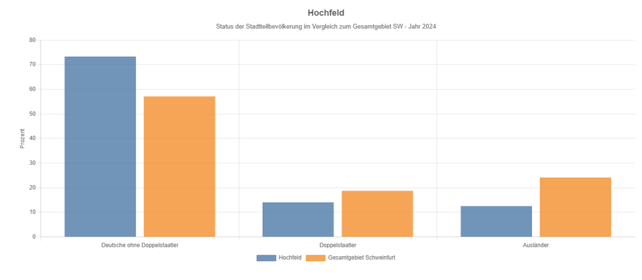 Der Anteil der ausländischen Mitbürger ist mit 12,6% (2018 10,1%, 2010 5,2%) im Vergleich zum Durchschnitt des Gesamtgebietes mit 24,1% (vgl. 2010 11,7%) gering. Auch Aussiedler, die die Gruppe der Doppelstaatler einbezieht, gibt es mit 14,1% (vgl. 2010 9%) nicht viele und sie liegen 4,7 Prozentpunkten unter dem Gesamtdurchschnitt Schweinfurts (2010 6,2 Prozentpunkte) mit 18,8%.