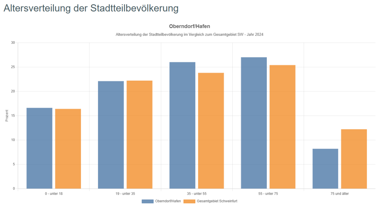 Die Gebiete Oberndorf und Hafen machen 2024 mit 2.503 Personen (vgl. 2016 2482,2014 2489, 2010 2561, 2001 2474) 4,4% der Gesamtbevölkerung Schweinfurts aus, Oberndorf / Hafen ist das kleinste Planungsgebiet.