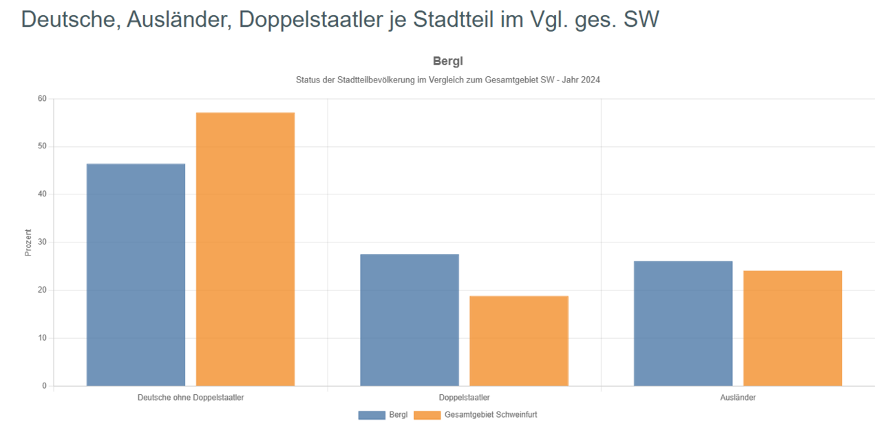 Die Gruppe der Doppelstaatler, macht 2024 einen Anteil von 27,5% aus (vgl. 2018 24%, 2014 23,4%, 2010 21,5%, 2003 14,8%), 8,7 Prozentpunkte höher als im Gesamtstadtgebiet mit 18,8% (vgl. 2018 19,8%, 2014 7,3 Prozentpunkte höher bei 16,1% des Gesamtstadtgebiets).