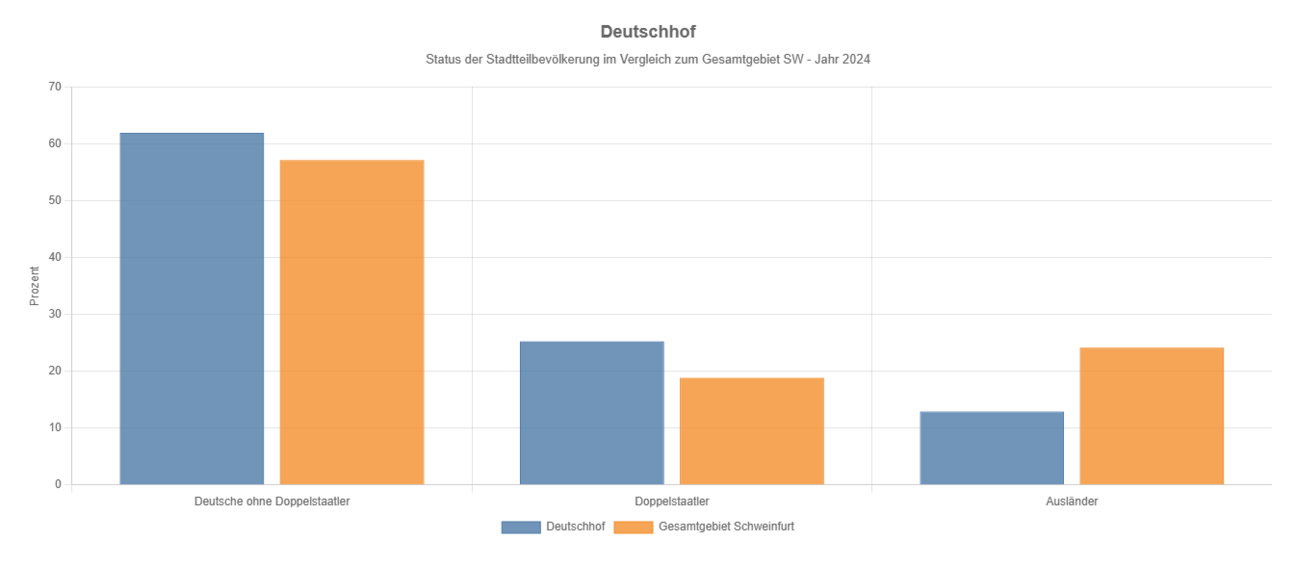 Der Ausländeranteil ist 2024 mit 12,9% (vgl. 2018 8,5%, 2010 5% und 2004 4,3%) am Deutschhof gering. Die meisten Aussiedler Schweinfurts wohnen nicht am Deutschhof (1.451 Doppelstaatler), wie oft angenommen wird, sondern am Bergl (2.527 Doppelstaatler). Im Verhältnis zur Gesamtbevölkerung im jeweiligen Stadtteil macht diese Gruppe jedoch am Deutschhof mit 25,2% (wie auch am Bergl mit 27,5%) fast ein Viertel der Stadtteilbevölkerung aus.