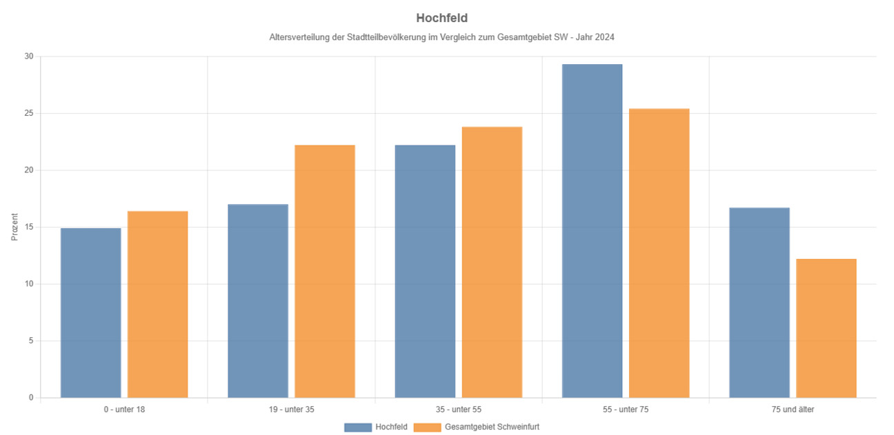 Das Gebiet zeigt eine leicht überalterte Struktur (55- bis 75-Jährige) auf. 2024 sind 7.685 Personen (vgl. 2018 7716, 2010 7862, 2001 8133) gemeldet und machen 13,7% der Bevölkerung Schweinfurts aus.