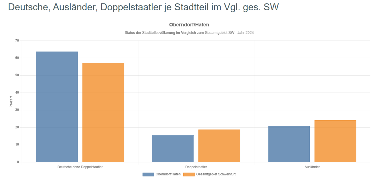 Allgemein ist festzuhalten, dass das Gebiet Oberndorf bisher als intakter und sozial gefestigter Stadtteil beschrieben werden kann. Der Ausländeranteil liegt im Durchschnitt.